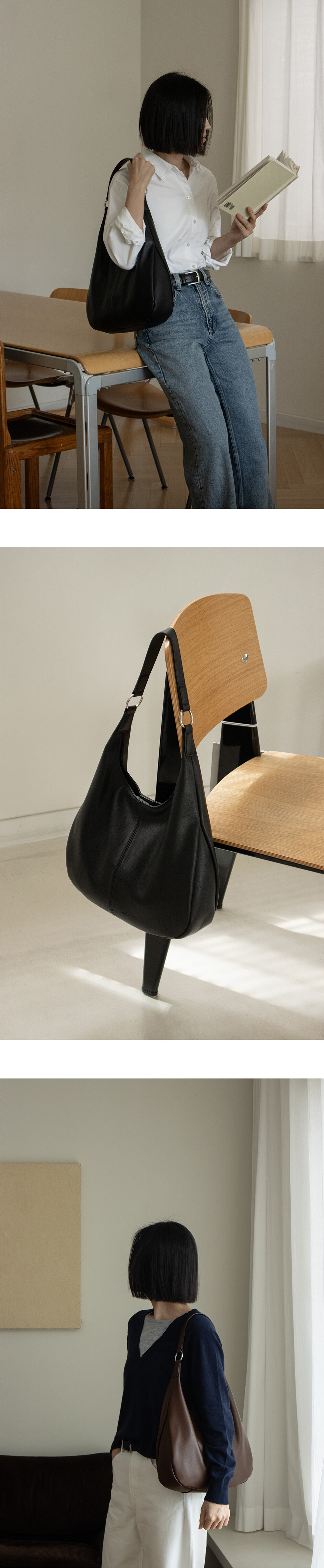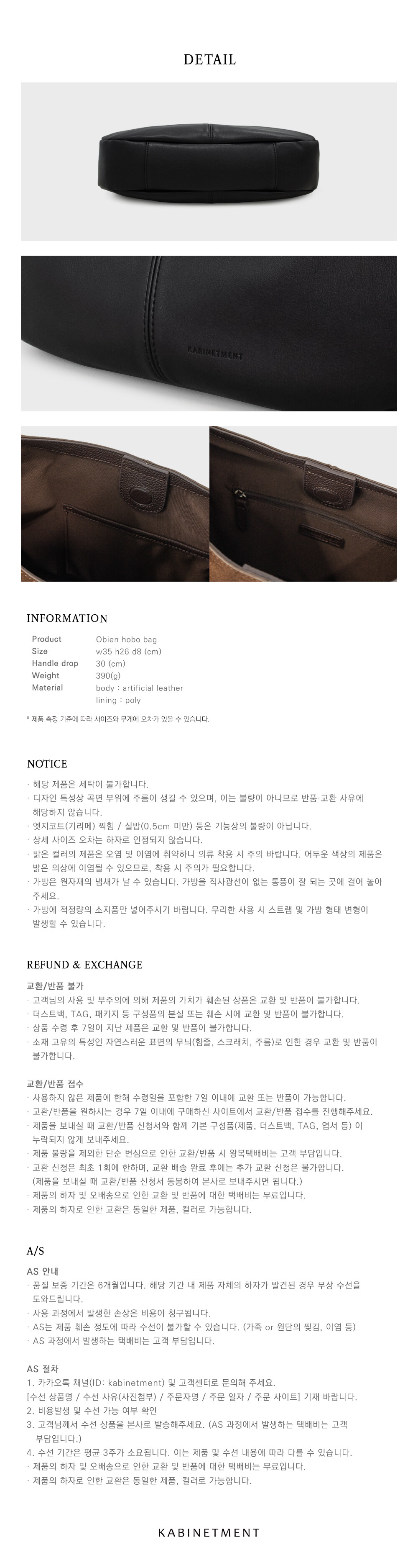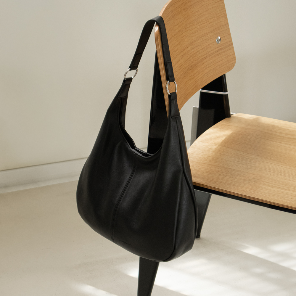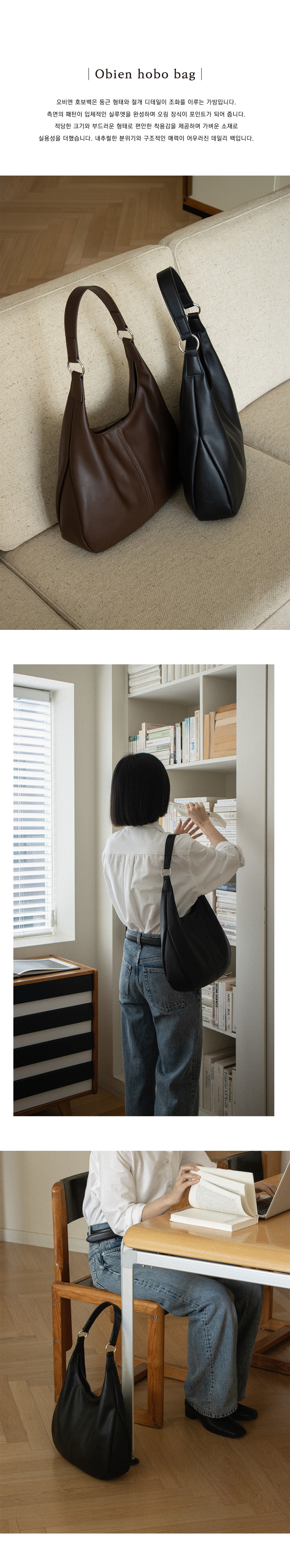 오비엔 호보백은 둥근 형태와 절개 디테일이 조화를 이루는 가방입니다. 측면의 패턴이 입체적인 실루엣을 완성하며 오링 장식이 포인트가 되어 줍니다.