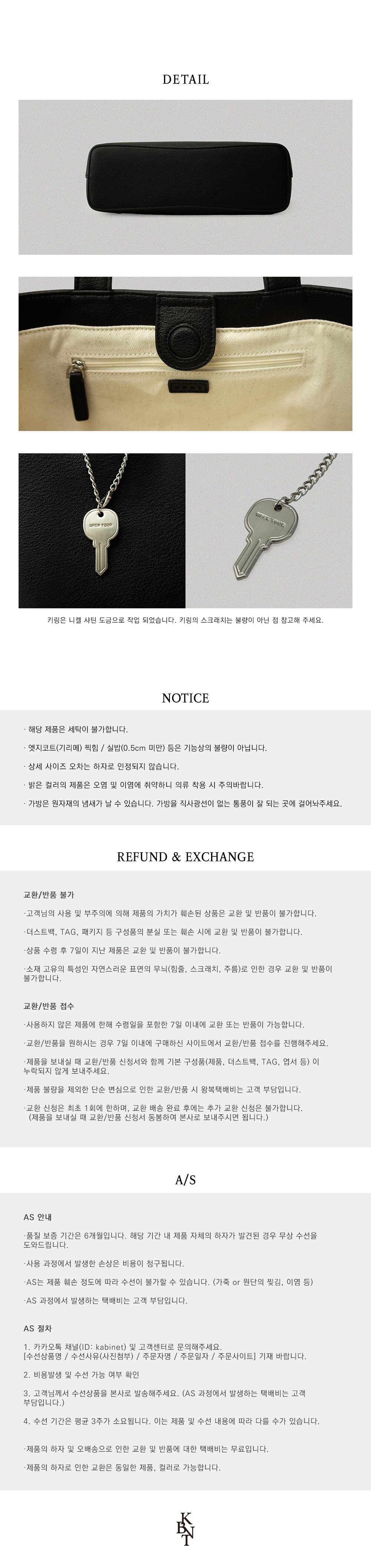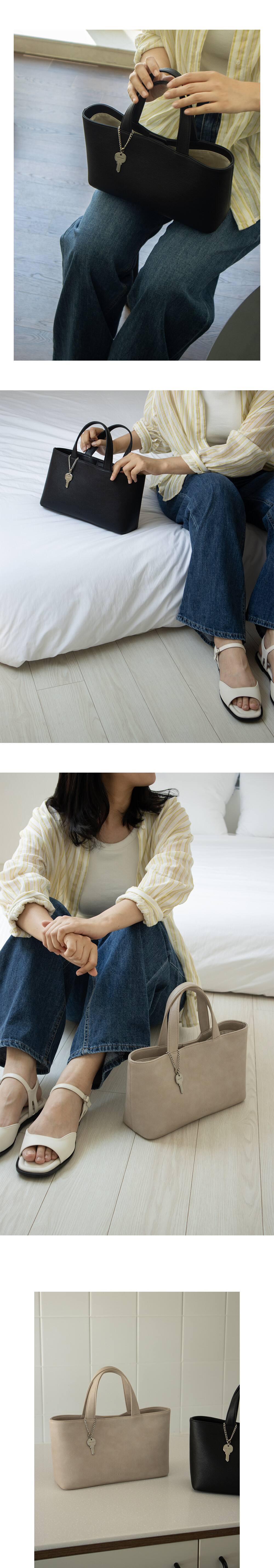 세련된 가로 비례와 은은한 투톤 질감의 원단으로 완성된 가방입니다. 반듯한 형태에 적당한 바디감이 특징입니다. 핸들에는 탈부착이 가능한 열쇠 모양의 참 장식이 달려있습니다.